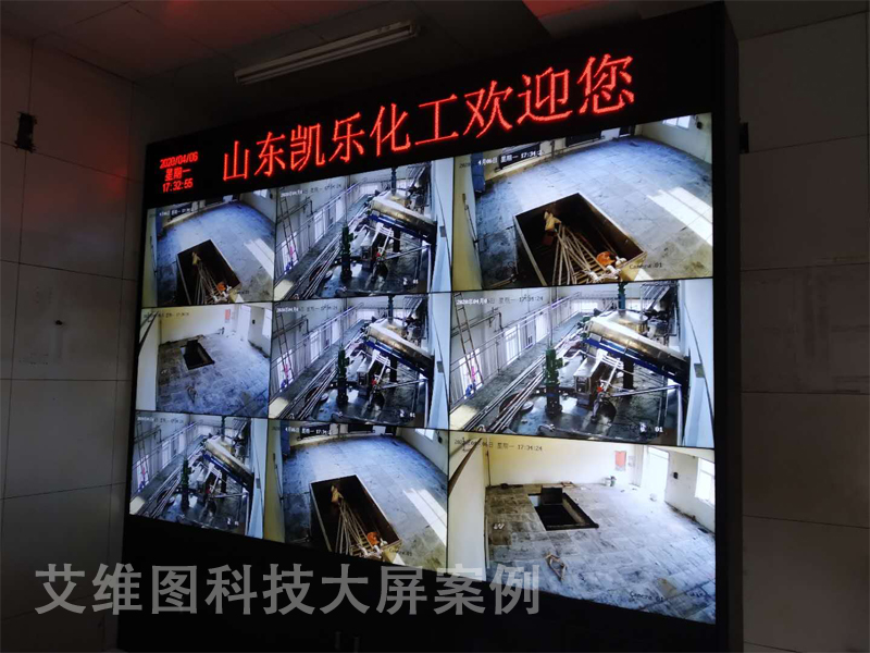 本次高清液晶大屏幕拼接屏監控系統建設,共包含9臺49寸LG拼接屏、1臺海康威視解碼矩陣、9單元落地機柜電視墻、1套3人位操作臺、1套P3.75單色LED顯示屏,9套高清信號線材等從,分別用在山東省棗莊市凱樂化工有限公司高清視頻監控室。