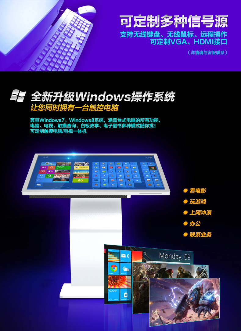 (2)顯示、觸控、PC系統(tǒng)一體化超薄設(shè)計(jì);取消傳統(tǒng)顯示器、主機(jī)、音響、外設(shè)分離模式,高度一體集成,銜接更好、節(jié)約空間;更簡(jiǎn)潔、更節(jié)能;