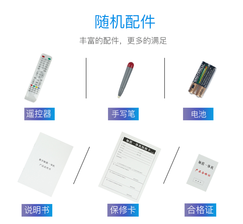 用戶手冊,保修卡,合格證,電源線,遙控器、電池、白板光盤,觸摸筆,壁掛支架
